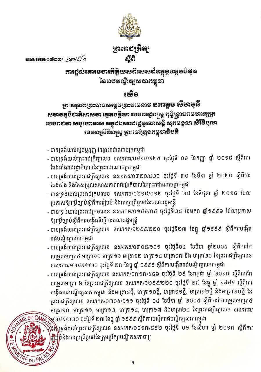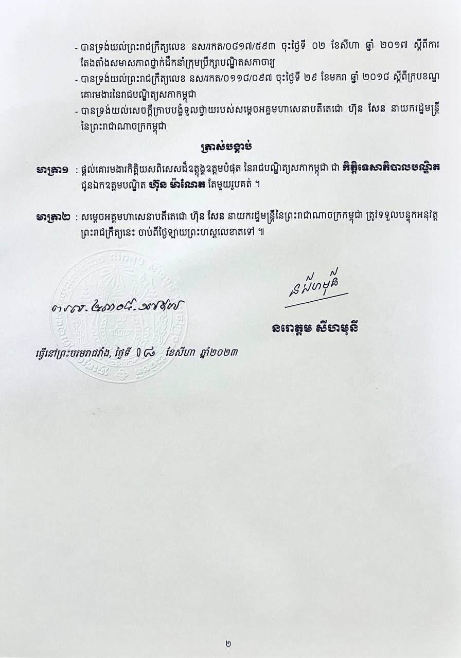 ឯកឧត្តម កិត្តិសង្គហបណ្ឌិត គន់ គីម សូមអបអរសាទរជូនឯកឧត្តមបណ្ឌិត ហ៊ុន ម៉ាណែត ដែលត្រូវបានព្រះមហាក្សត្រផ្តល់គោរមងារ កិត្តិយសពិសេសដ៏ឧត្តុង្គឧត្តមបំផុត ជា «កិត្តិទេសាភិបាលបណ្ឌិត»