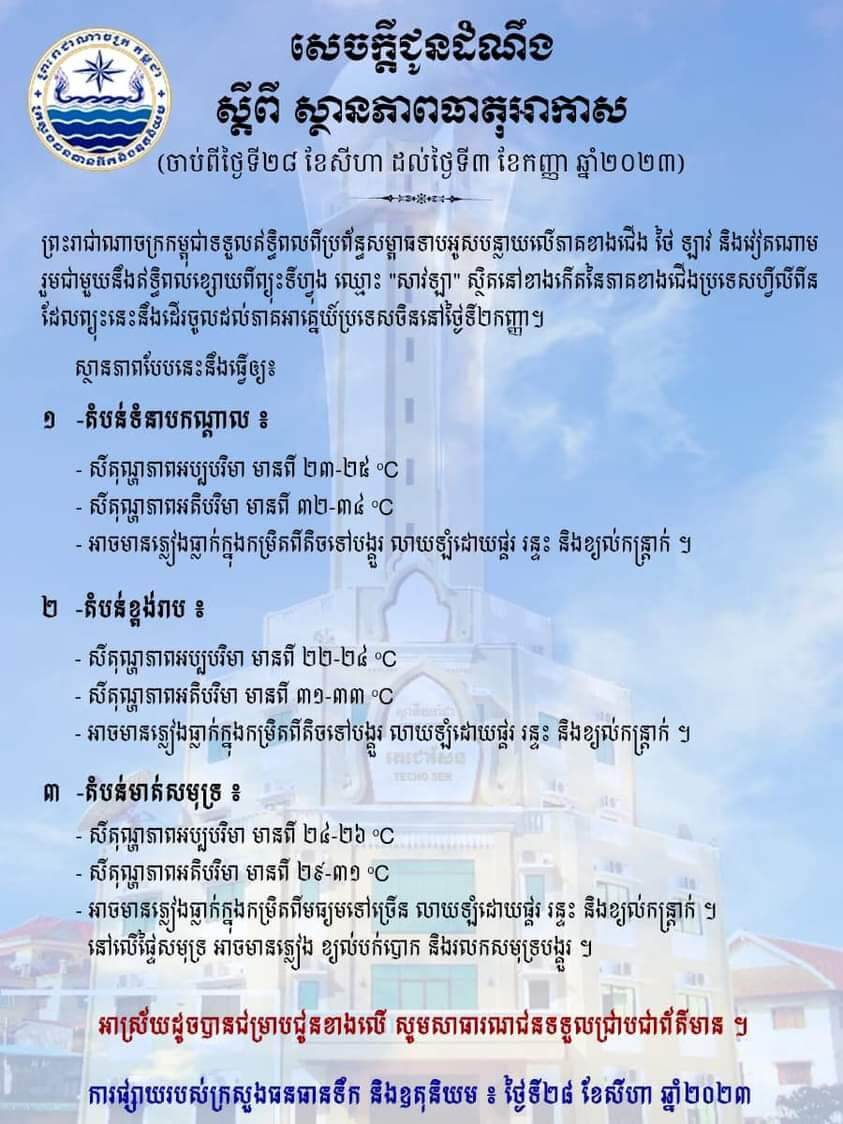សេចក្តីជូនដំណឹងស្តីពីការព្យាករធាតុអាកាសធាតុចាប់ពីថ្ងៃទី២៨ ខែសីហា ដល់ថ្ងៃទី៣ ខែកញ្ញា ឆ្នាំ២០២៣៖